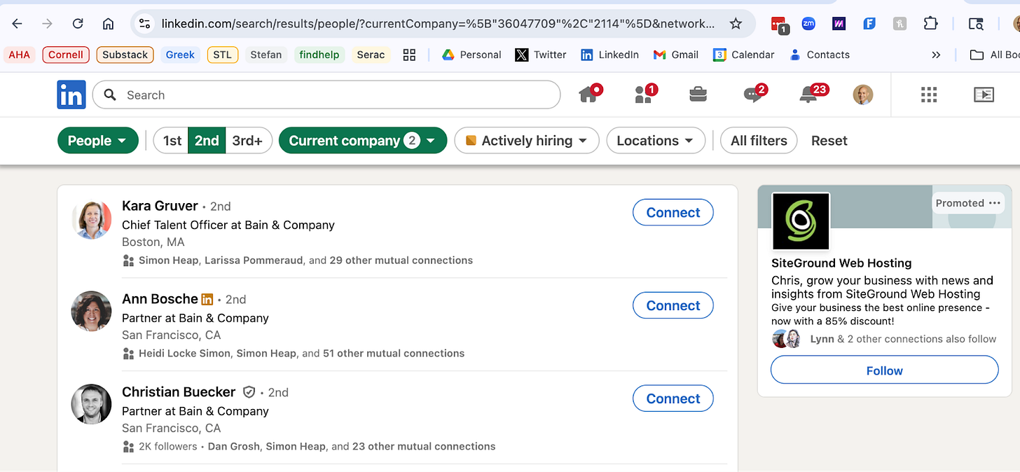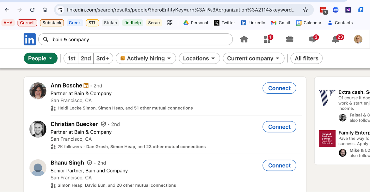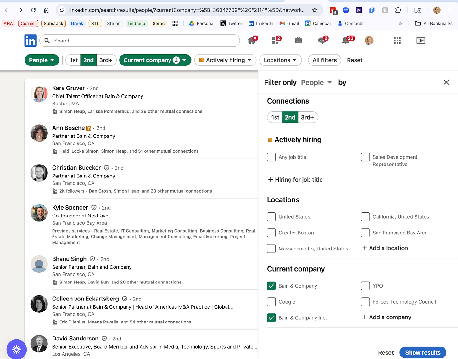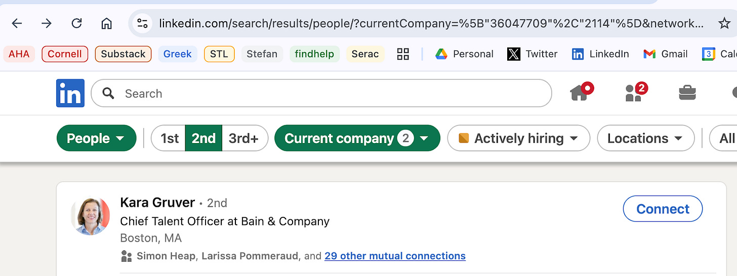 This then brings you to a People search results page that looks like the first one I generated, but the difference here is that the results just show people who currently work at Bain & Company and not people who have “Bain & Company” in the text of their LinkedIn description. The ideal target is a current employee of your target company so this search is better for that.