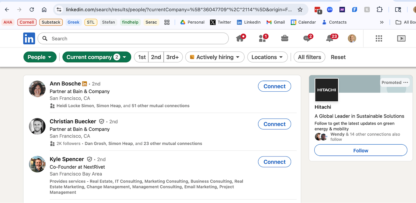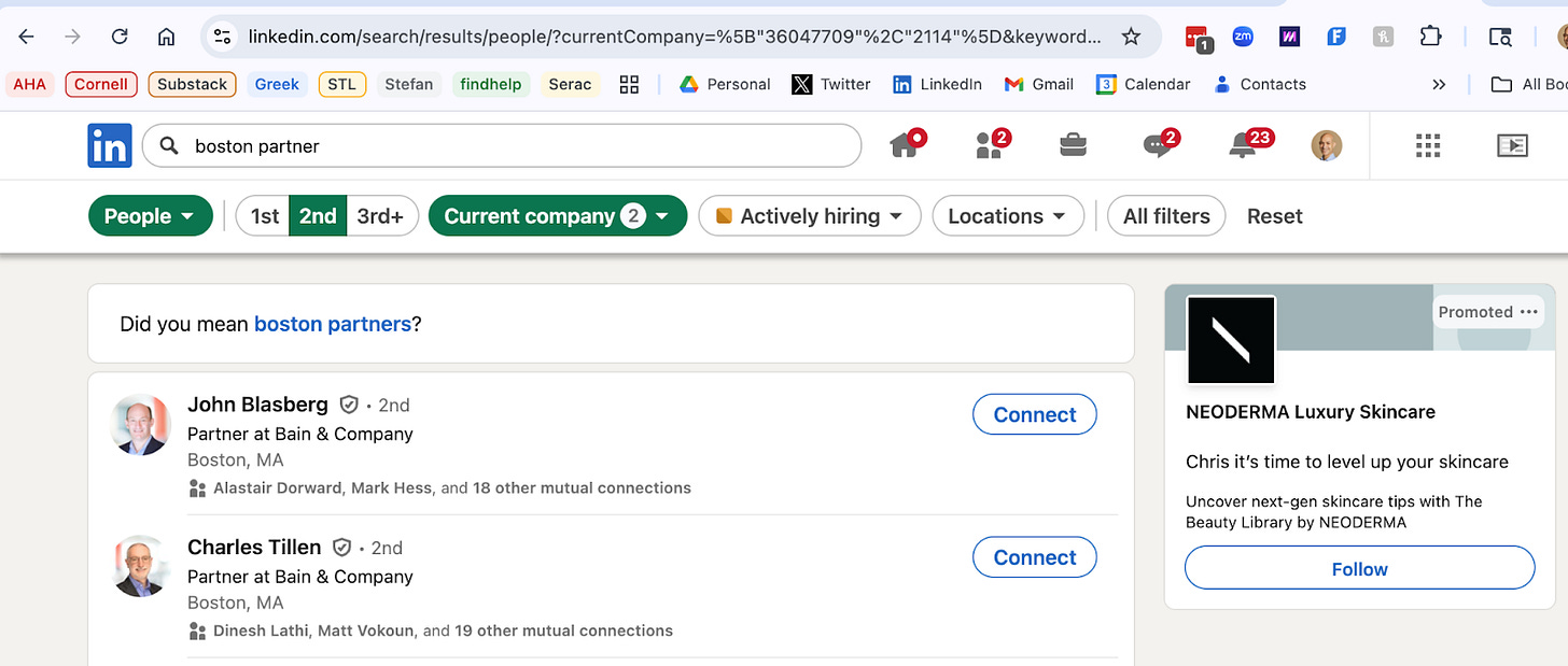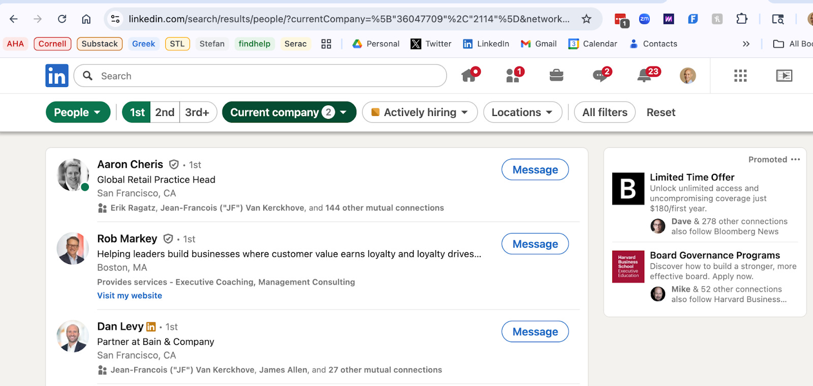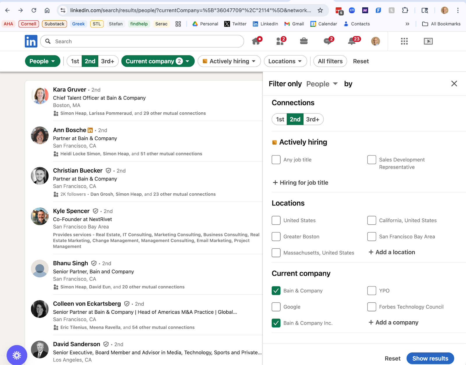 This then brings you to a People search results page that looks like the first one I generated, but the difference here is that the results just show people who currently work at Bain & Company and not people who have “Bain & Company” in the text of their LinkedIn description. The ideal target is a current employee of your target company so this search is better for that.