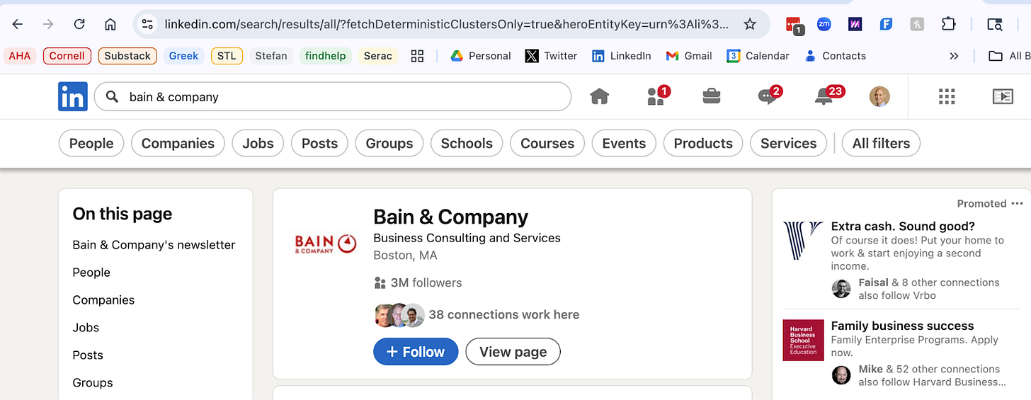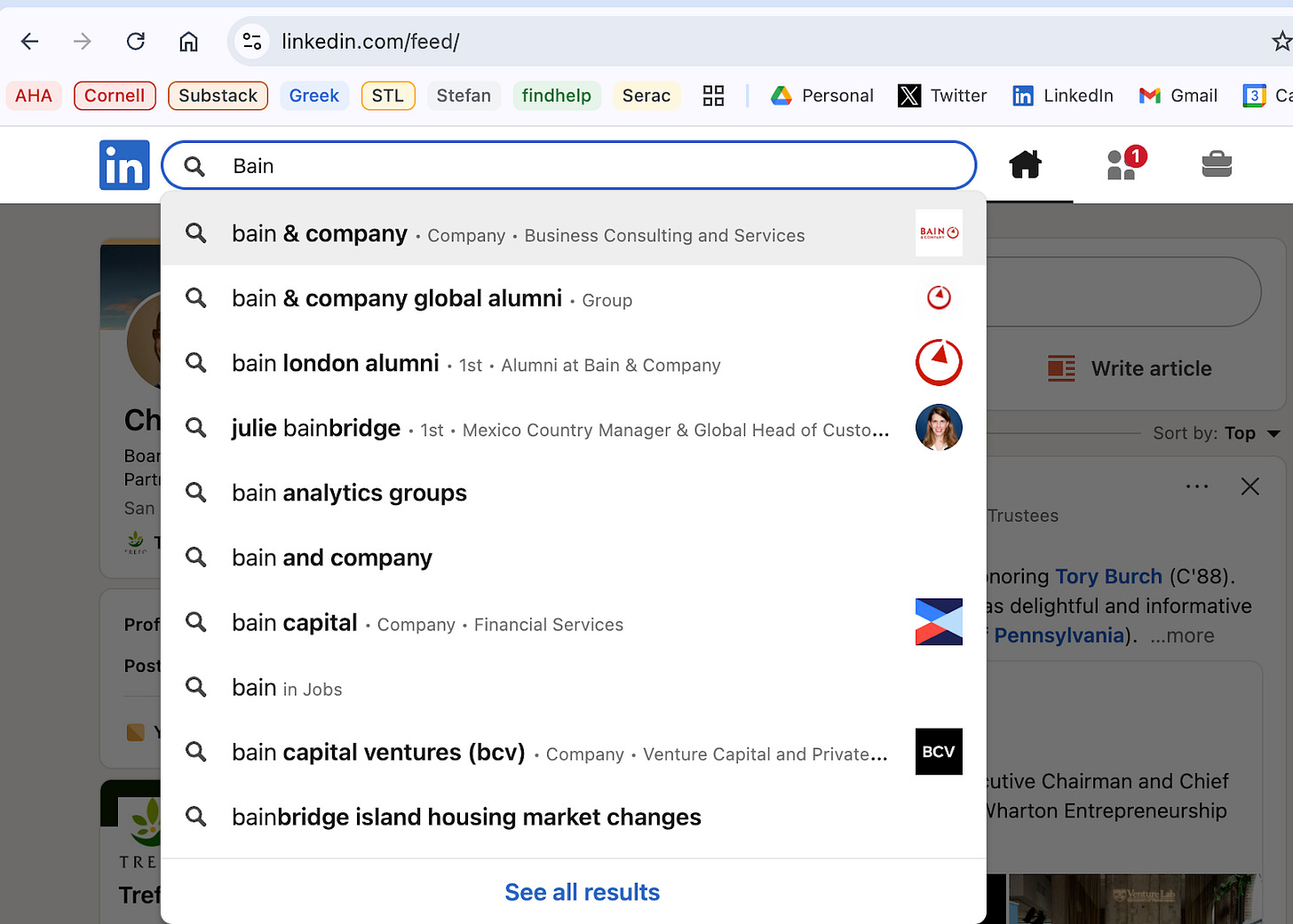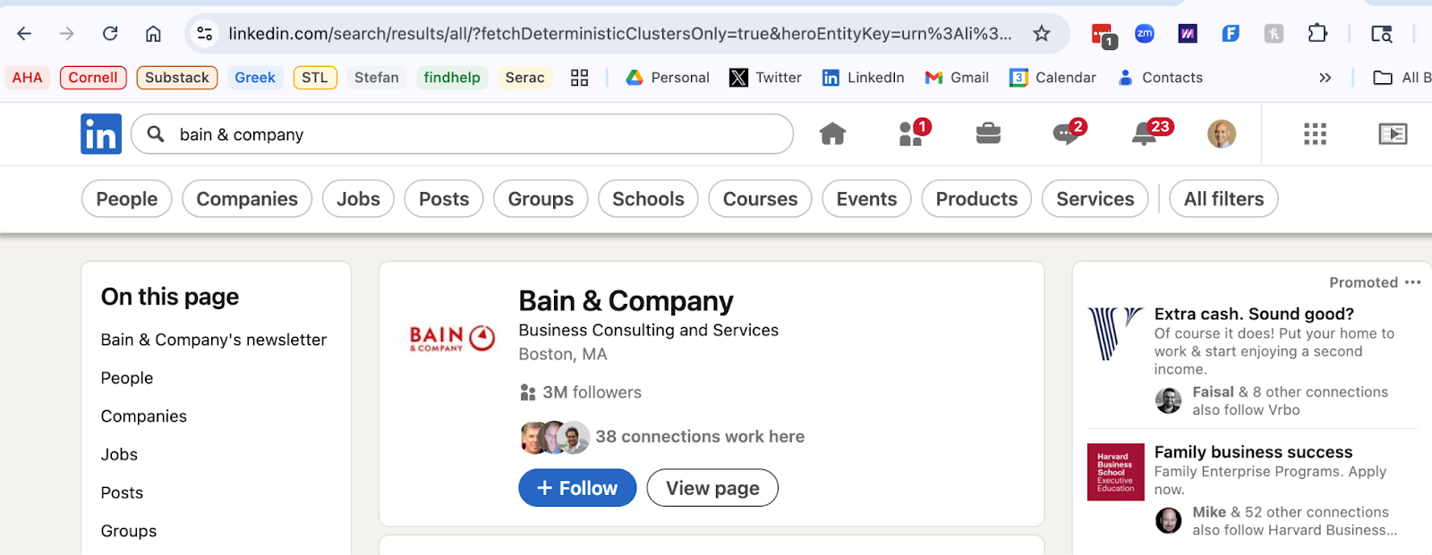 Once you click on the name, you get a search results page with Bain & Company at the top.