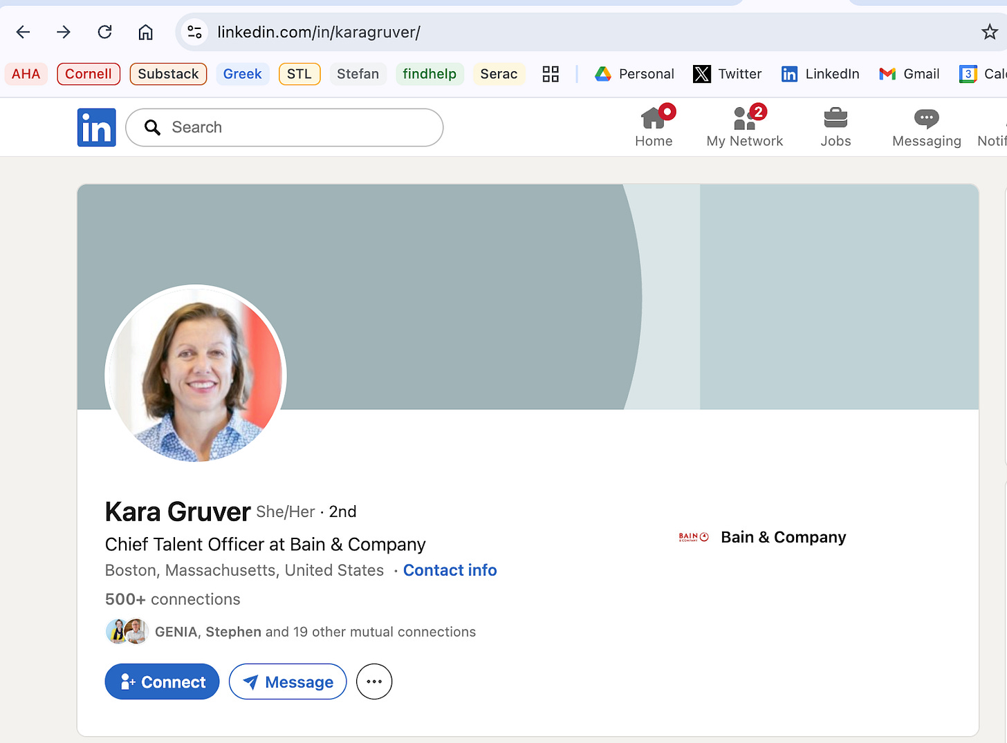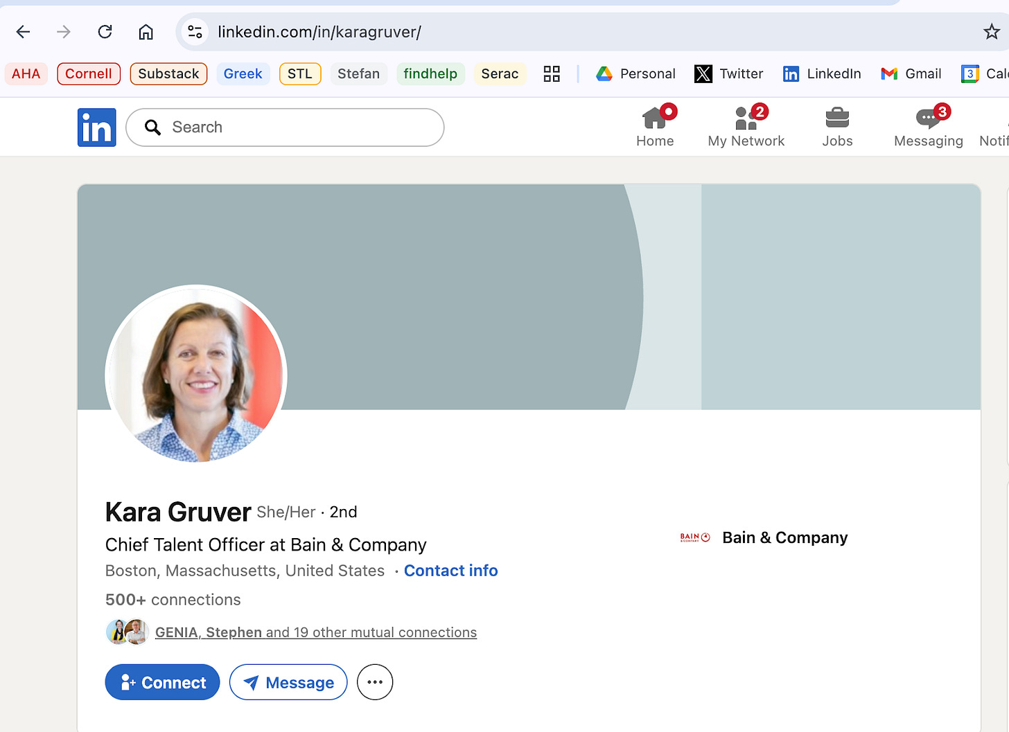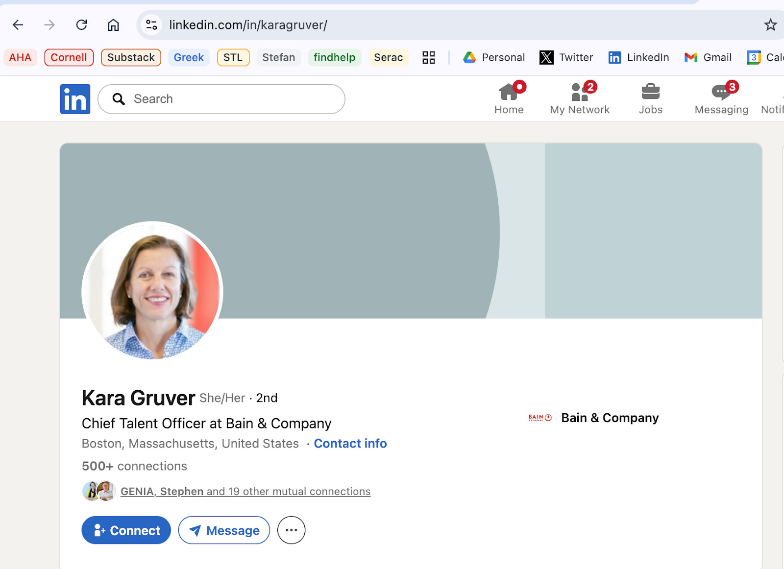 I see that you are connected to Kara Gruver on LinkedIn (https://www.linkedin.com/in/karagruver/). I am interested in learning more about Bain & Company and would appreciate getting some advice from Kara. Do you know her well enough to potentially make an introduction?