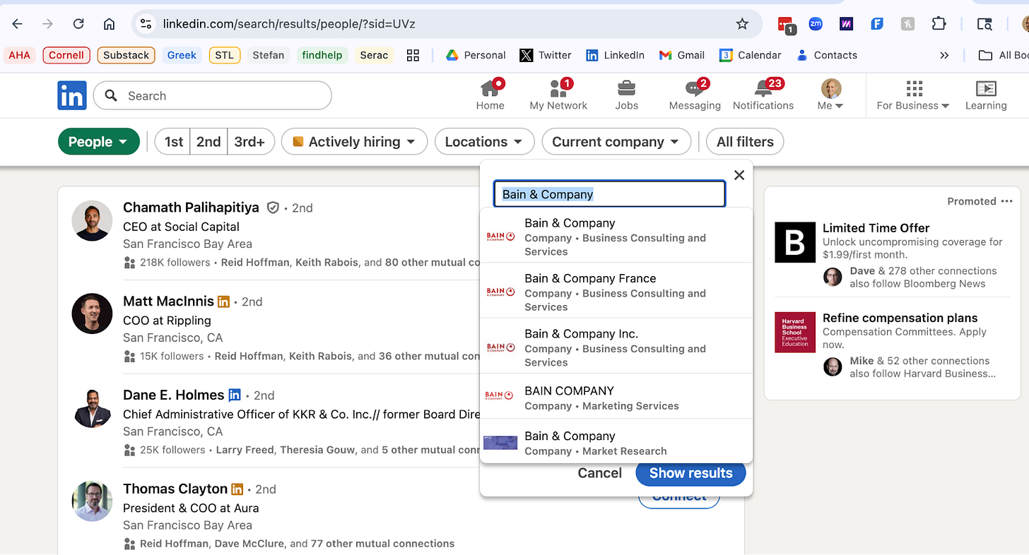From here, you can click on “People” in the upper left to limit your search to people who have the text “Bain & Company” in their LinkedIn profiles